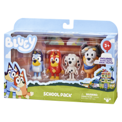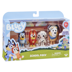 The School Pack figurine set includes Bluey, two of her friends Chloe and Rusty and their school teacher Calypso. Join them in all of the fun of the classroom.