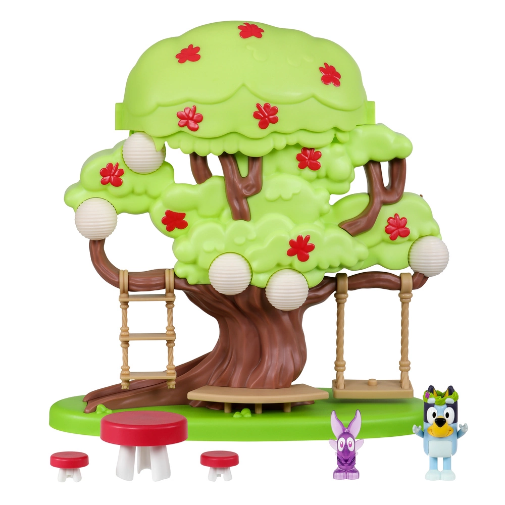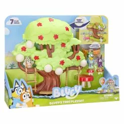 Recreate some of the most memorable moments from the show in the Bluey Tree Playset! This playset is huge at a whopping 27.9cm tall. Feature-packed and with 2-sided play, the playset has so many different places to play and things for your child to discover. Kids can make their figures climb up the ladder, ride the swing, slide down the slide, and even relax in the hammock. There is even a secret door behind the canopy for your child to discover a Fairy inside the Fairy Hideaway! The Bluey Tree Playset includes a table and stool accessories. It also comes with stickers for kids to decorate the tree. The 6.35cm Bluey figure is wearing a Flower Crown and is articulated and poseable with moving arms and body.