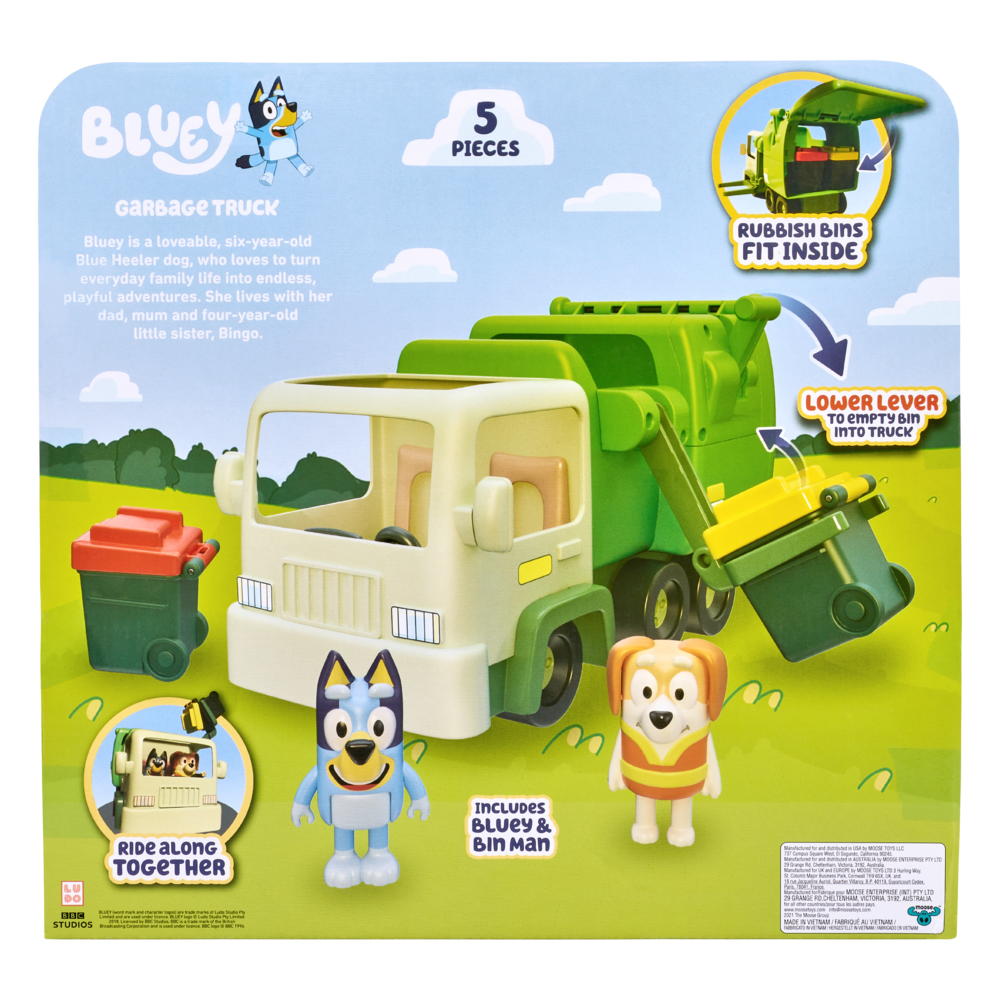 - The Bluey Garbage Truck Playset includes a 6.35 cm Bluey and Bin Man figure.