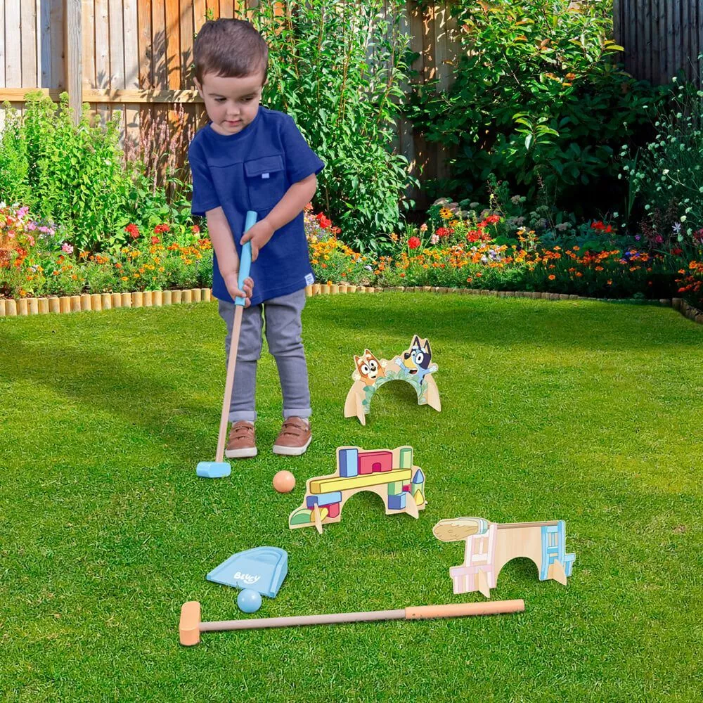 Turn your garden or living room into a crazy golf course with this 18 piece Bluey Crazy Golf Set. With three obstacles to face, Bluey fans will have a lot of fun trying to conquer the course. The final stage is trying to aim the ball into the final hole! Make sure to use the 4 score cards to keep tabs on who the winner is! A great game to play with friends and family which develops children’s hand eye coordination and motor skills. The Bluey Crazy Golf Set is made from responsibly sourced materials, the wooden products are certified by the FSC.