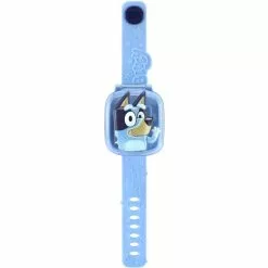 Let’s play with Bluey, Bingo and the Wackadoo Watch! This wristwatch for kids featuring Bluey includes eight digital clock faces, time tools and four games. Hear the voices of Bluey and Bingo guide you through games that include characters from the show. Bandit has wound Bingo up like a wind-up toy! Press the left and right buttons to help Bingo avoid obstacles that appear in the classroom. Bluey wants to play a game of keepy-uppy! Help Bluey keep a balloon off the ground by using the left and right buttons. At Hammerbarn, Bluey wants to buy the same thing as Bingo. Match an object with its shadow to find a matching item. See Bingo hide her plush bunny Floppy into one of three chickenrat eggs and mix them up. Watch carefully and choose the egg where Floppy is hidden. Time tools include a stopwatch, timer and alarm. Wackadoo!